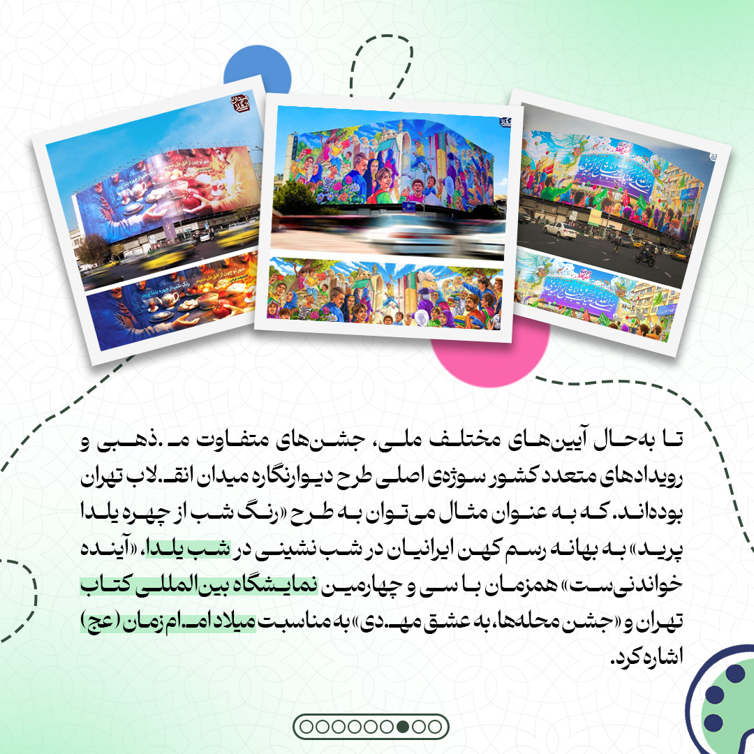به گزارش روابط عمومی سازمان تبلیغات اسلامی، در روزهای اخیر طرح تازهی دیوارنگارهی میدان انقلاب تهران همزمان با میلاد باسعادت حضرت علی(ع) و روز پدر رونمایی شد. به مناسبت اکران نخستین طرح این دیوارنگاره در سال جدید فعالیت آن، در این شماره از نشریه دیجیتال نگاهی میاندازیم به بزرگترین دیوارنگارهی ایران و برخی از طرحهای آن در یکسال گذشته را با یکدیگر مرور میکنیم.