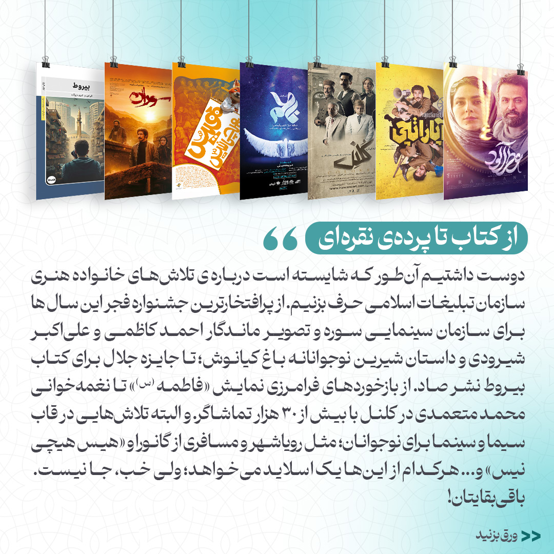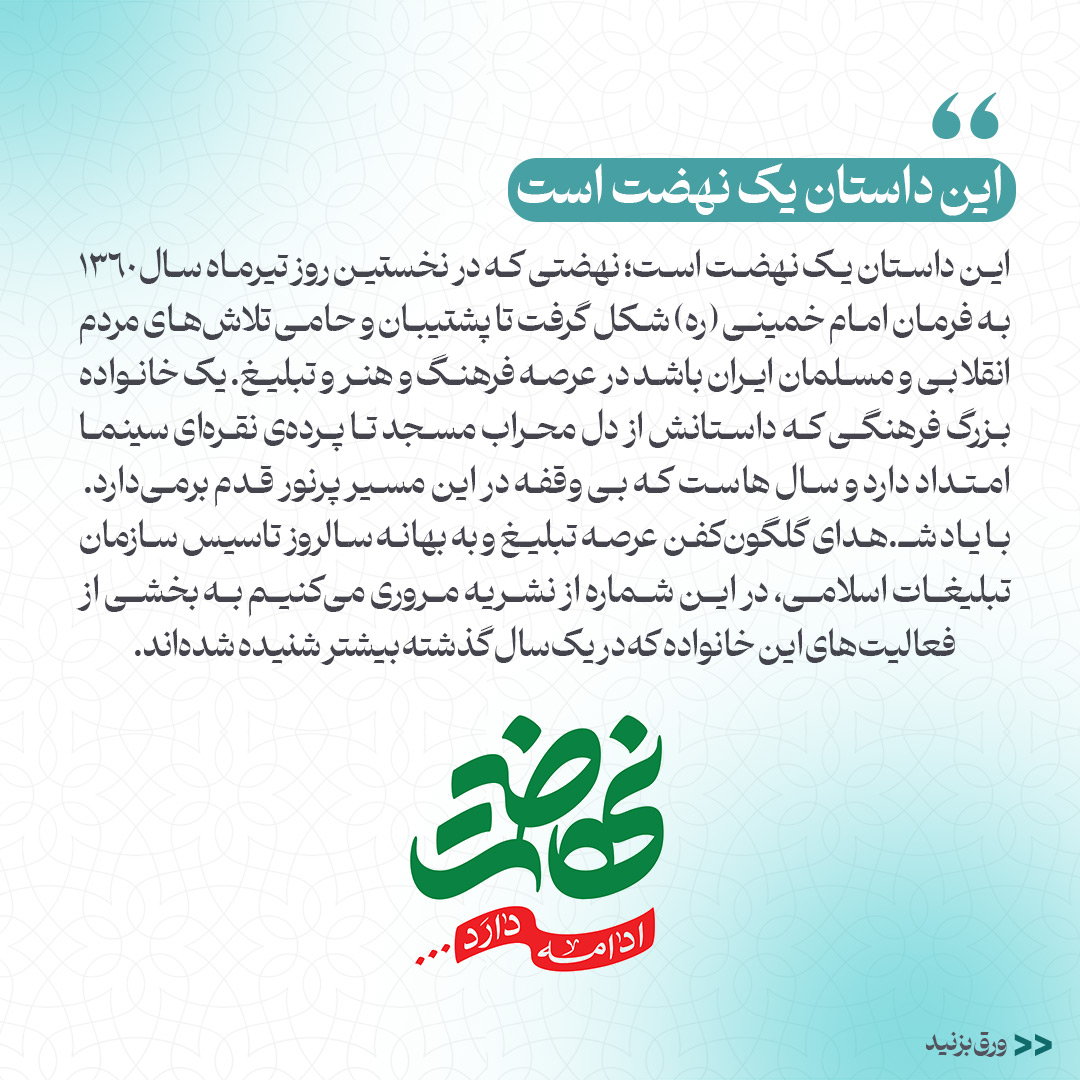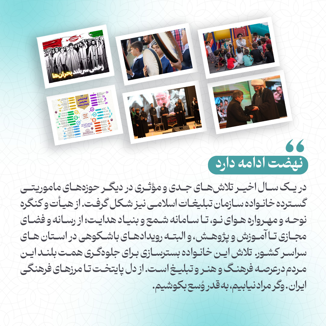 به گزارش روابط عمومی سازمان تبلیغات اسلامی، این داستان یک نهضت است؛ نهضتی که در نخستین روز تیرماه سال ۱۳۶۰ به فرمان امام خمینی (ره) شکل گرفت تا پشتیبان و حامی تلاشهای مردم انقلابی و مسلمان ایران باشد در عرصه فرهنگ و هنر و تبلیغ. یک خانواده بزرگ فرهنگی که داستانش از دل محراب مسجد تا پردهی نقرهای سینما امـتـداد دارد و سـالهاسـت که بیوقفه در این مسیر پرنور قدم برمیدارد. با یاد شهدای گلگونکفن عرصه تبلیغ و به بهانه سالروز تاسیس سازمان تبلیغات اسلامی، در این شماره از نشریه مروری میکنیم به بخشی از فعالیتهای این خانواده که در یک سال گذشته بیشتر شنیدهشدهاند.
