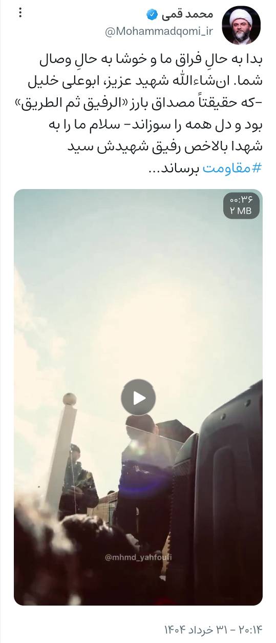 به گزارش روابط عمومی سازمان تبلیغات اسلامی، حجتالاسلام محمد قمی، رئیس سازمان تبلیغات اسلامی، در پی اعلام خبر شهادت «ابوعلی خلیل»، یار همیشگی سید شهدای مقاومت که روح بلندش به مراد خود پیوست، با انتشار ویدئویی از این شهید عزیز در صفحه شخصی خود نوشت: