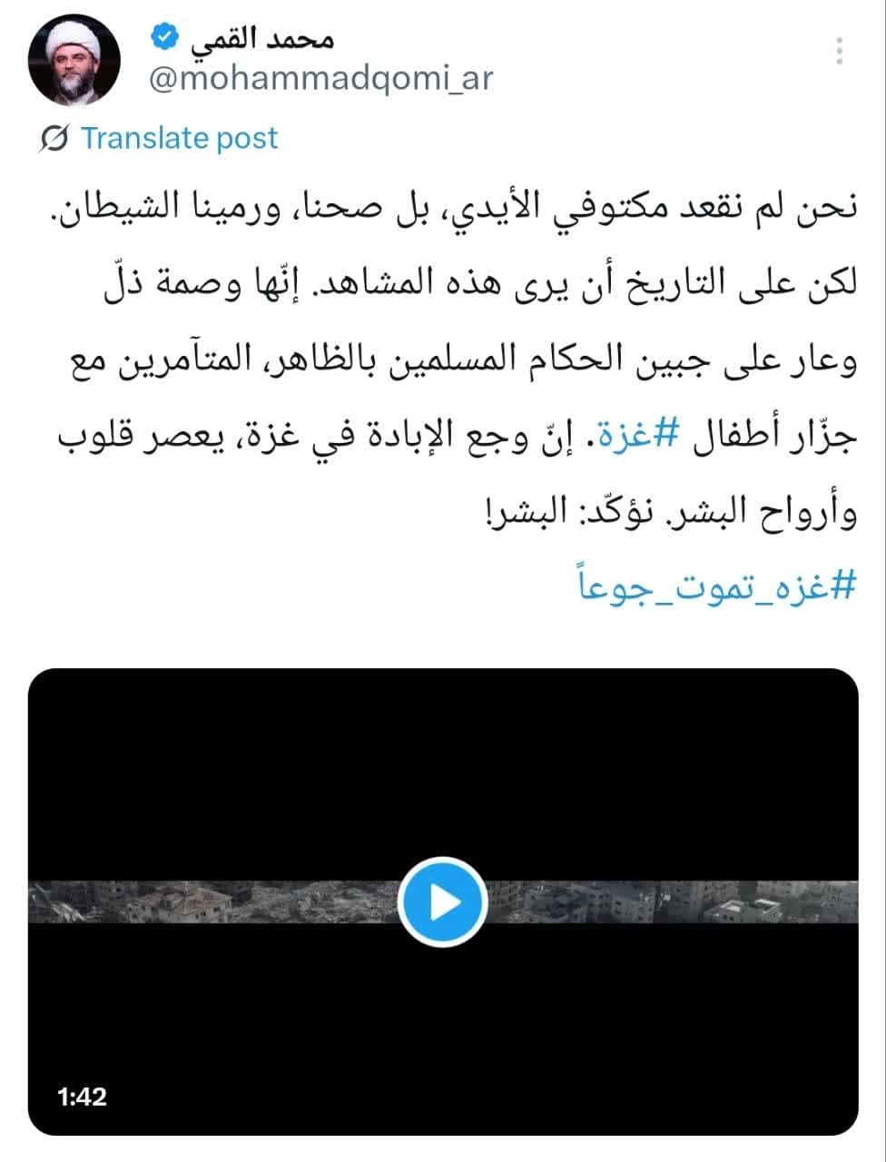 به گزارش روابط عمومی سازمان تبلیغات اسلامی، حجتالاسلام محمد قمی، رئیس سازمان تبلیغات اسلامی در صفحه شخصی خود در شبکه اجتماعی ایکس به زبان عربی با انتشار تصاویری از وضعیت این روزهای ساکنان مجاهد و صبور نواز غزه و پیامی تأملبرانگیز با صدای أبوعبیده، سخنگوی قهرمان گردانهای شهید عزّالدین قسّام نوشت؛
