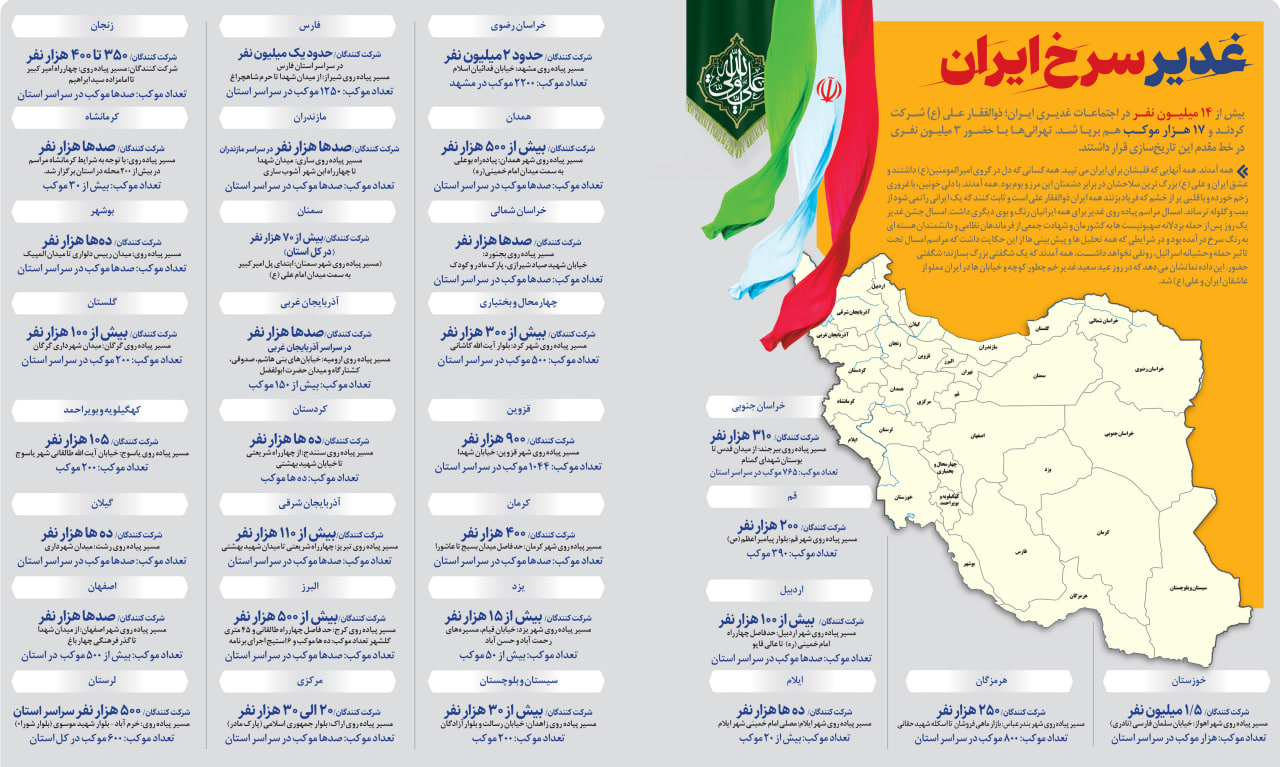 مردم امسال در عید غدیر به جای جشن و شادی، به خیابان آمدند تا غیرتشان را فریاد کنند و مهمانی کیلومتری غدیر تبدیل شد به اجتماع «ایران؛ ذوالفقار علی».این اطلاعنگاشت مروری دارد به عدد و رقمهای تاریخی غدیر امسال، از حضور ۱۴ میلیون نفری مردم و برپایی ۱۷ هزار موکب در اجتماعات غدیر در سراسر کشور.