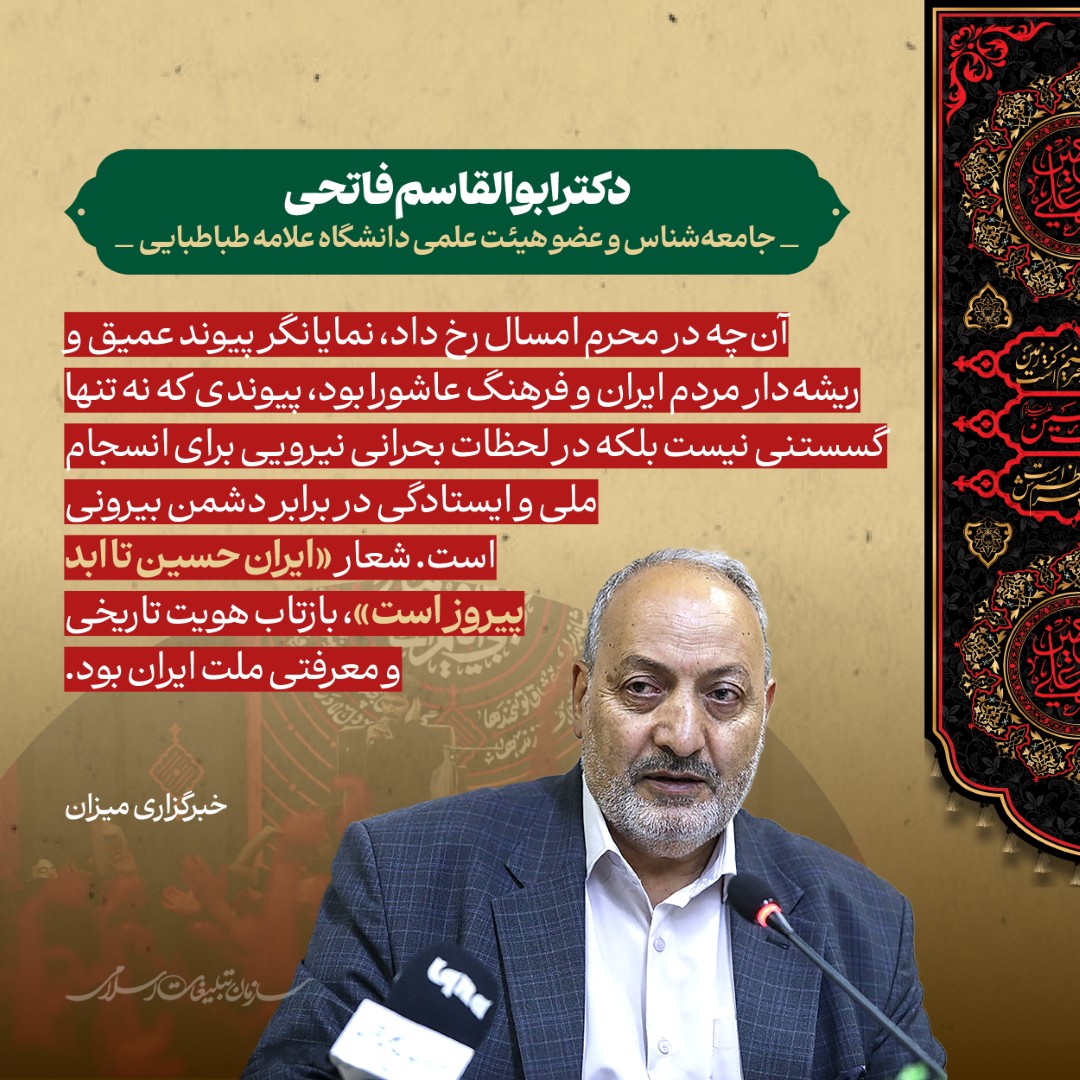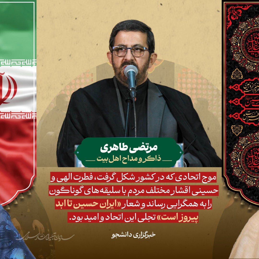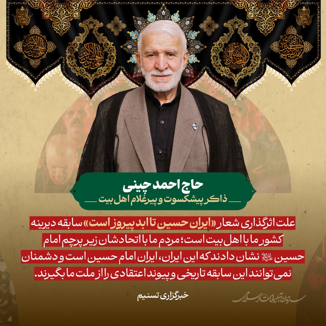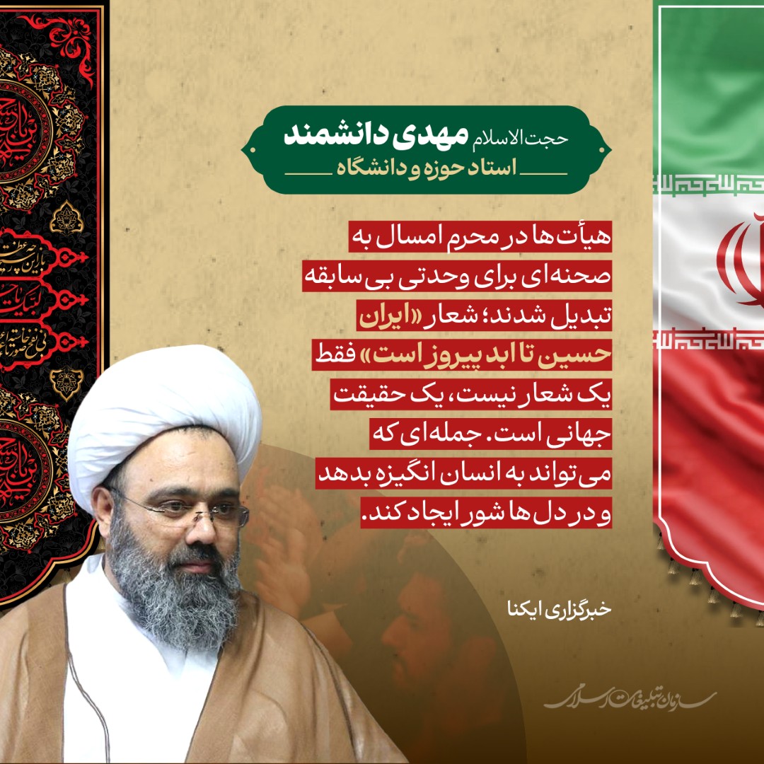 به گزارش روابط عمومی سازمان تبلیغات اسلامی، در پی تقارن جنگ تحمیلی 12روزه و ایام عزای سیدالشهدا علیهالسلام شعار «ایران حسین تا ابد پیروز است» از سوی سازمان هیات و تشکلهای دینی به عنوان شعار مشترک هیئات در محرم امسال انتخاب شد. شعاری که در اشعار مداحیها و پرچمهای عزا تا دل مردم و دستنوشتههایشان مرور شد؛ جلوهای از پیوند عمیق مکتب حسینی و آیین ایرانی با همراهی پرشور مردم کشورمان. در این اطلاعنگاشت نظر برخی از چهرهها در خصوص این شعار را باهم مرور میکنیم.