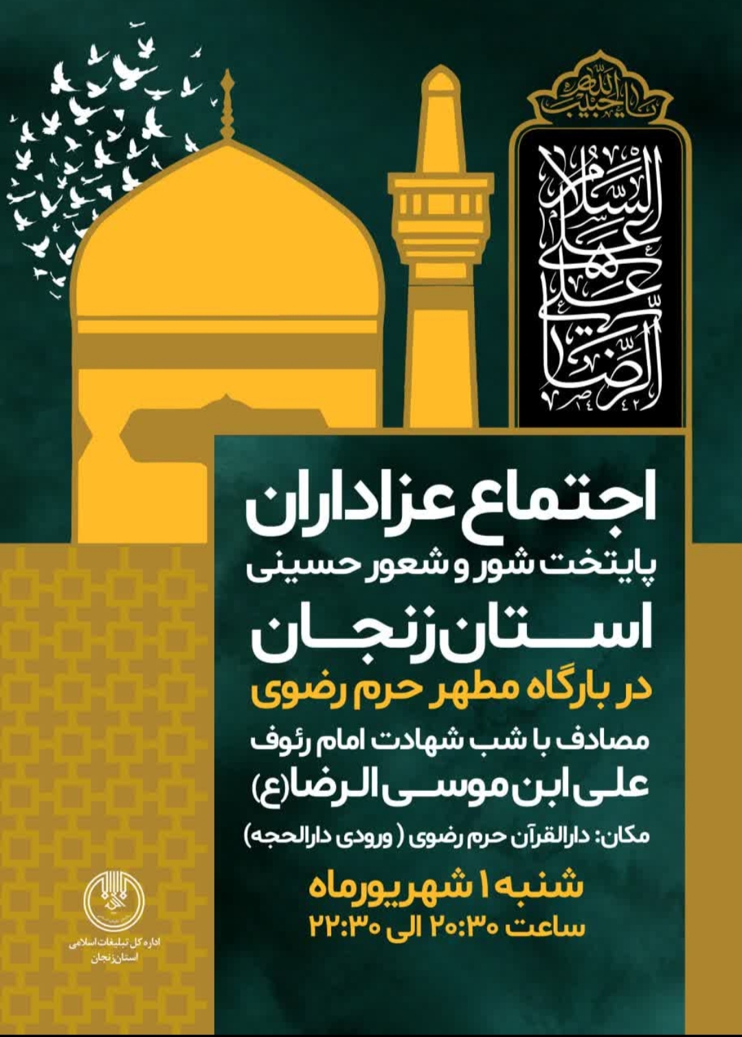 همزمان با فرارسیدن سالروز شهادت هشتمین امام همام، حضرت علی بن موسیالرضا (ع)، اجتماع باشکوهی از عزاداران استان زنجان روز شنبه، ۱ شهریورماه 1404 در حرم مطهر رضوی برگزار خواهد شد.