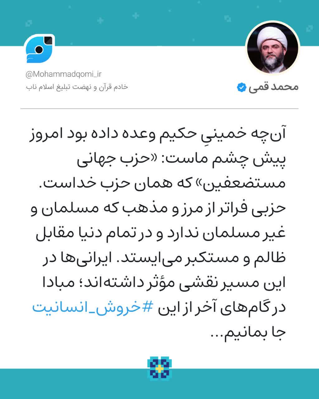 آنچه خمینیِ حکیم وعده داده بود امروز پیش چشم ماست: «حزب جهانی مستضعفین» که همان حزب خداست. حزبی فراتر از مرز و مذهب که مسلمان و غیر مسلمان ندارد و در تمام دنیا مقابل ظالم و مستکبر میایستد. ایرانیها در این مسیر نقشی مؤثر داشتهاند؛ مبادا در گامهای آخر از این خروش انسانیت جا بمانیم...