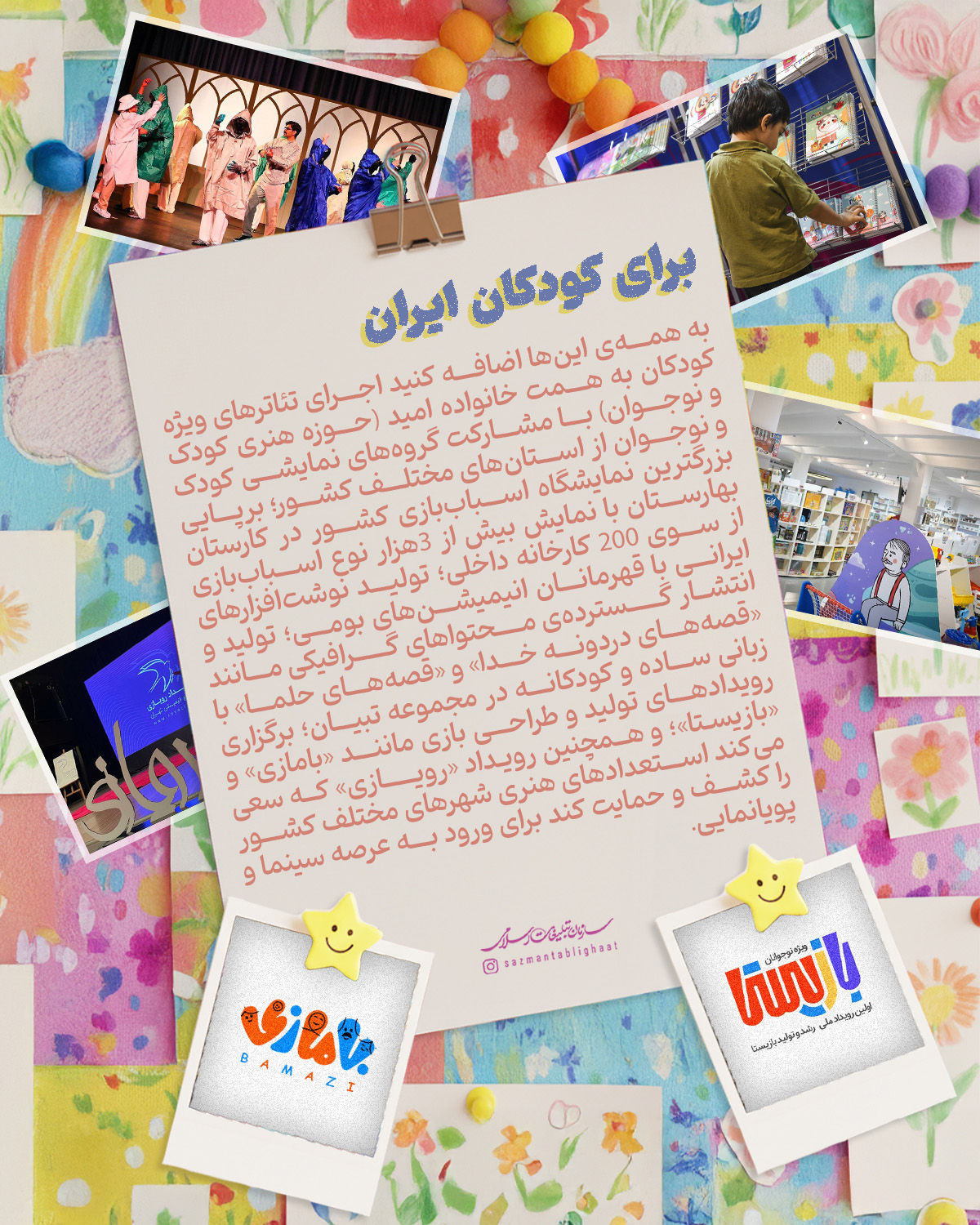 کودکان در سبد مخاطبان خانواده سازمان تبلیغات اسلامی «واقعاً» مهم تلقی میشوند؛ ما سعی کردهایم نگاه گلخانهای به کودکان نداشتهباشیم و در همه اجزا، توانمان را به کار بگیریم برای بچههای ایرانزمین. از پویانماییهایی با قهرمانان بومی، تا کتاب، پویش، بازی، برنامه و البته تربیت مربیان و مبلغان جوان و متخصص در حوزه کودک؛ این مجله گوشهای از تلاشهای این خانواده فرهنگی-تبلیغی برای آیندهسازان ایران را تصویر میکند.