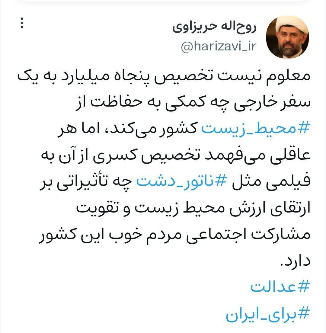 معاون آموزش و تعالی سازمان تبلیغات اسلامی در صفحه شخصی خود در شبکه اجتماعی ایکس با انتقاد از اولویتگذاریهای بودجهای دولت تأکید کرد: اختصاص پنجاه میلیارد به یک سفر خارجی بیفایده است، در حالی که حمایت اندک از آثاری چون «ناتوردشت» میتواند فرهنگ محیطزیست و مشارکت اجتماعی را تقویت کند.