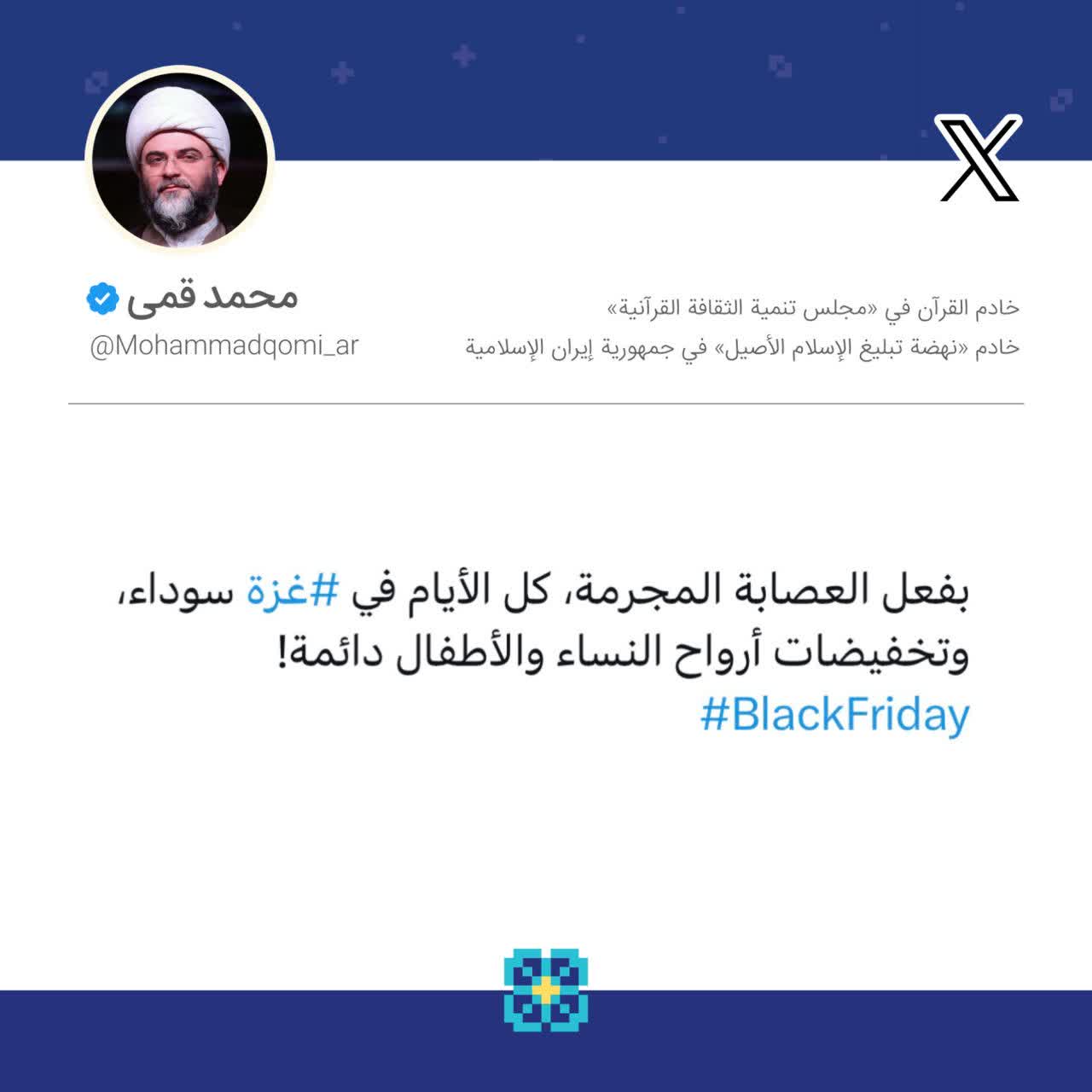 رییس سازمان تبلیغات اسلامی همزمان با موج گستردهی تخفیفهای بازار جهانی و داخلی و افزایش تب حراج (موسوم به جمعهی سیاه) در صفحه شخصی خود نوشت؛ به لطف باند جنایتکار، تمام روزهای هفته در غزه سیاه است و حراج جان کودکان و زنان همیشگی است.